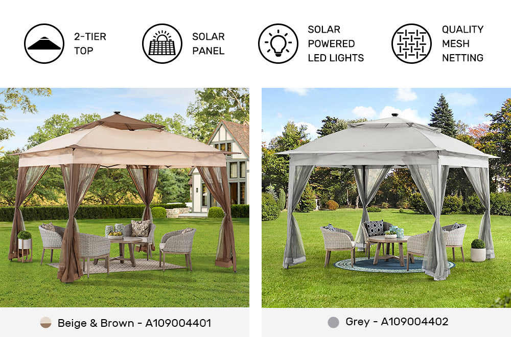 Instantly create an outdoor gathering spot for family and friends away from the glaring sun and pesky insects. This 11 ft. x 11 ft. soft-top, pop-up gazebo by the world’s leading ready-to-assemble outdoor structure maker, Sunjoy, creates a perfectly affordable and portable outdoor setting. The 2-tier roof provides just the right amount of airflow while keeping occasional inclement weather at bay. Keep cool in the shade beneath a canopy supported by a durable powder-coated steel frame. The weather-resistant fabric top is designed to withstand the outdoor elements while the zippered mesh panel nettings keep mosquitoes and other bugs away. Set the mood by turning on the incorporated solar-powered LED string lights for night-time fun and relaxation. With straightforward, easy-to-follow assembly instructions you’ll be relaxing in your favorite new outdoor living space in no time.