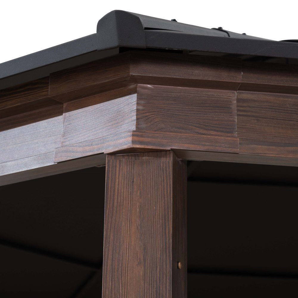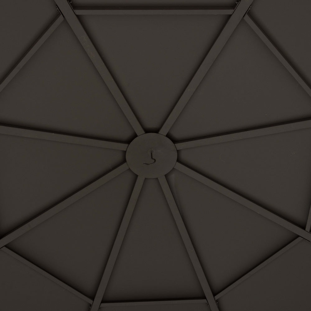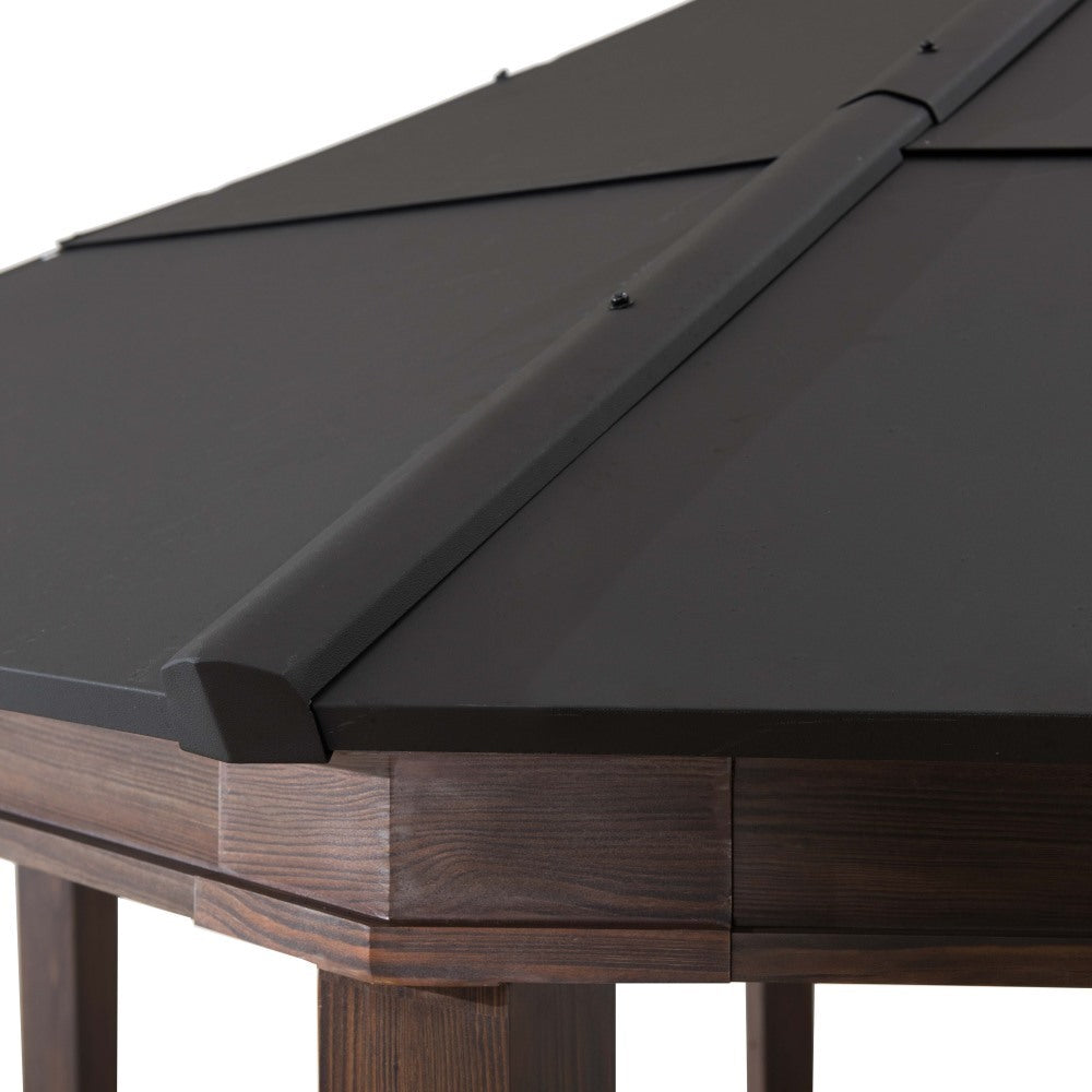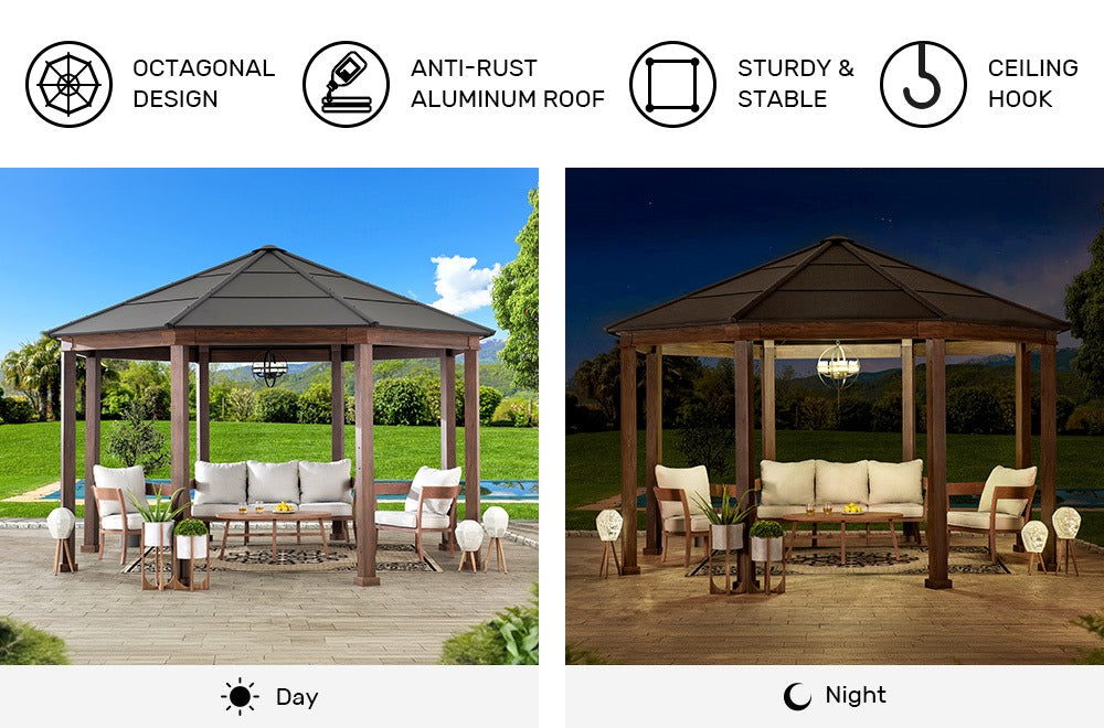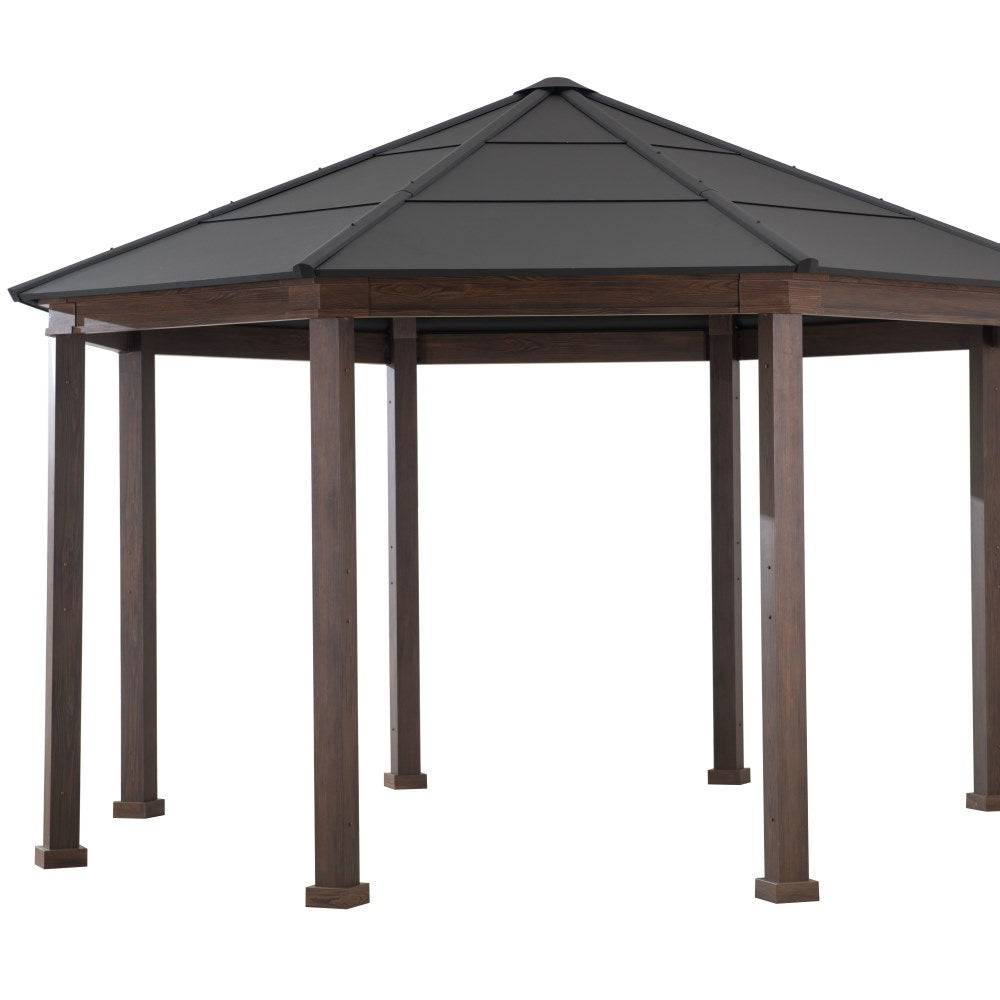 Improve your outdoor living space with the four-season Daybreak octagon gazebo by Sunjoy, the world's leading ready-to-assemble outdoor structure maker. It provides a shaded space to relax by the pool during hot summer days as well as a haven for friends and family to gather. The timeless brown weather-resistant powder-coated finish on the rust-proof aluminum roof will withstand the test of time. The roof design provides shade while keeping occasional inclement weather at bay. Enjoy the natural-looking appearance of a rich dark brown wood frame constructed of rust-proof aluminum and rust-resistant galvanized steel. Set the mood by suspending a chandelier from the incorporated ceiling hook for functional light and high design. With straightforward, easy-to-follow assembly instructions you will be relaxing with your beverage of choice in your favorite new outdoor living space for years to come.