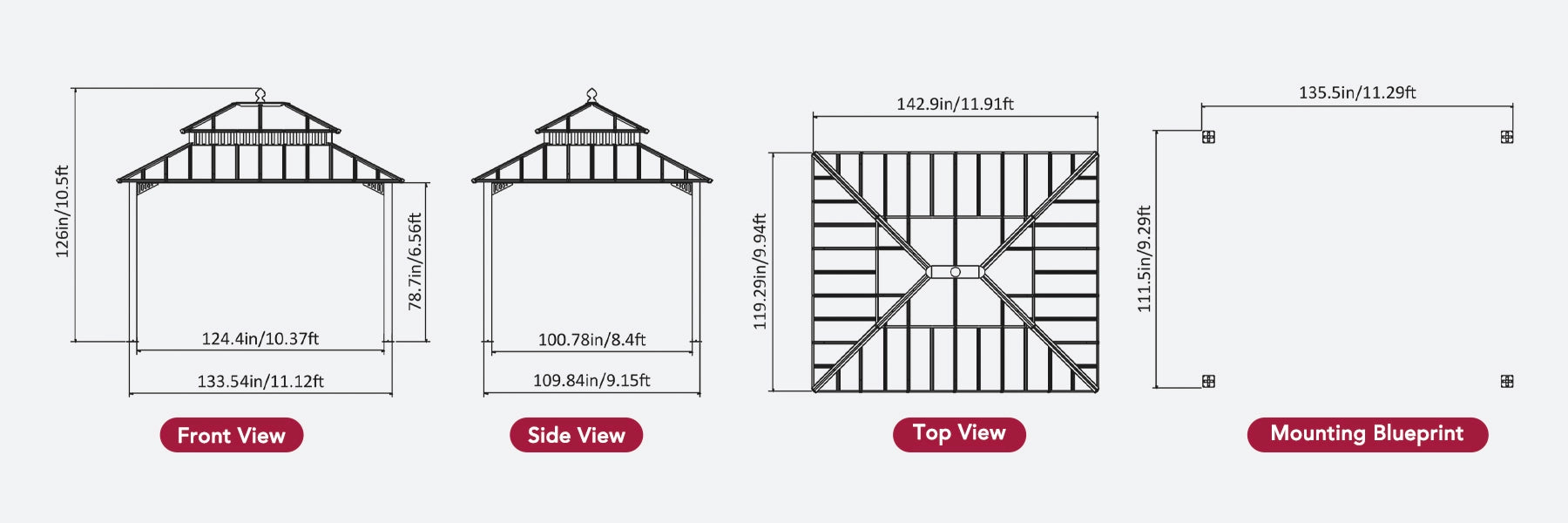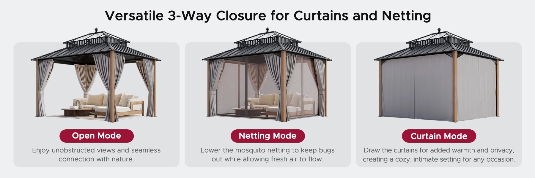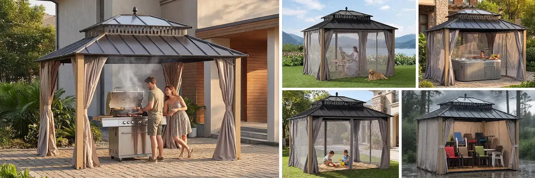 Introducing the Kingston gazebo series — engineered for serious weather, refined for backyard comfort. Crafted with a heavy-duty galvanized steel roof, rust-proof aluminum frame, and DIY friendly design, it provides year-round shelter with standout style.