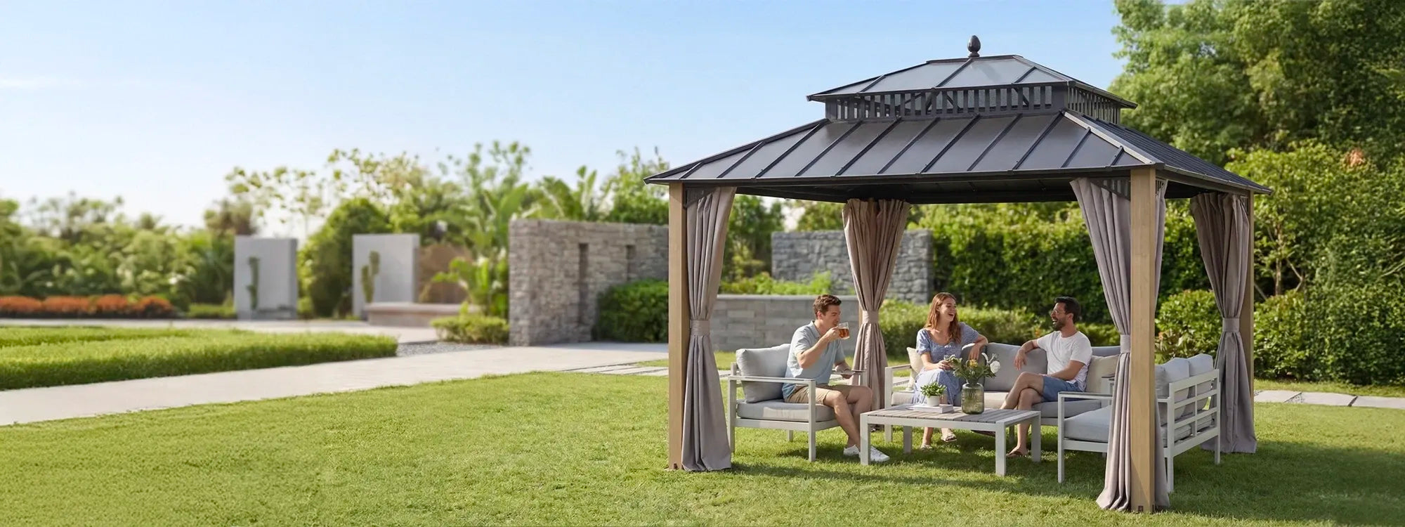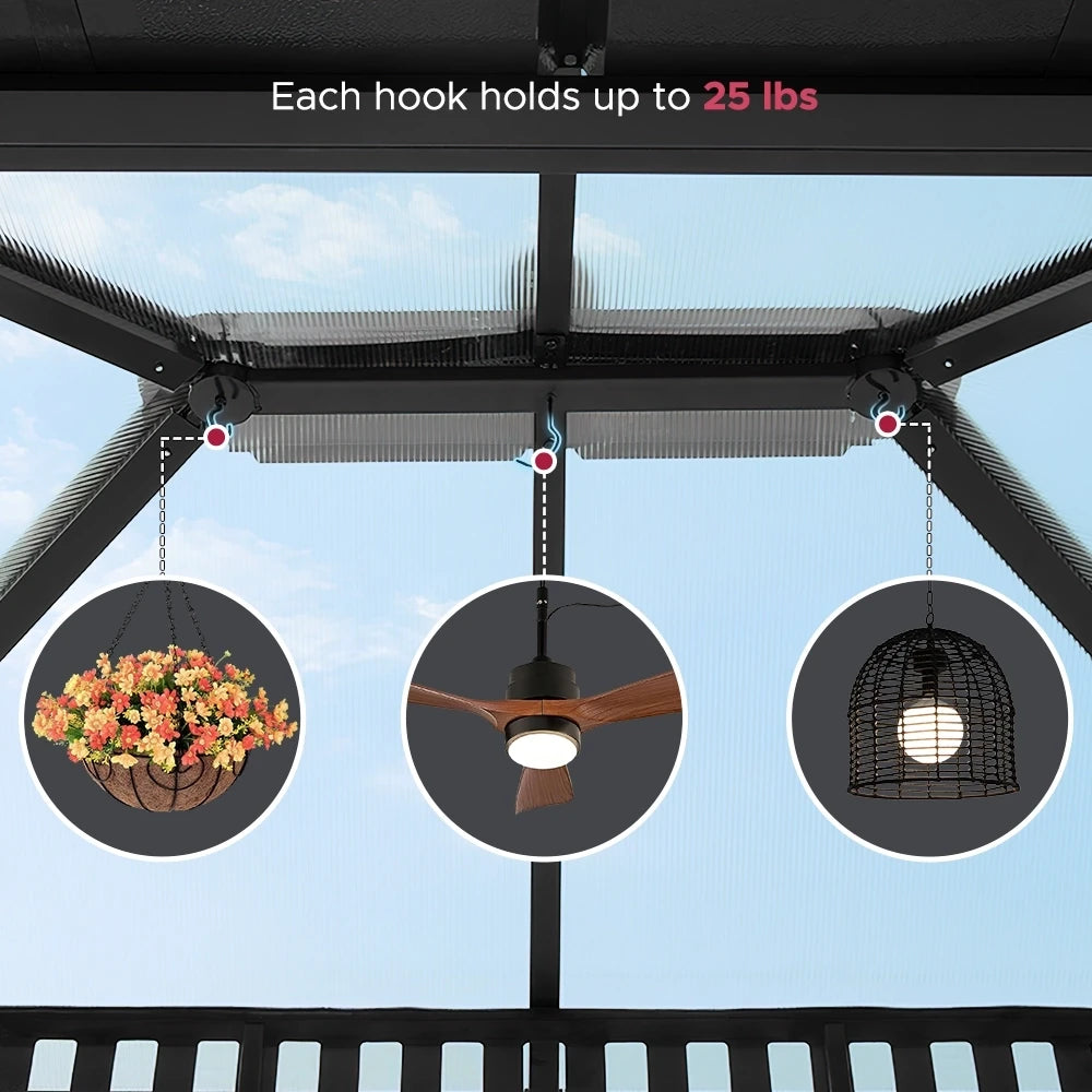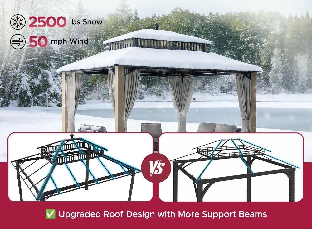 Year-round reliability. SUNJOY gazebos are built to handle harsh weather—sun, wind, rain, and snow—with powder-coated steel and vented roofs.