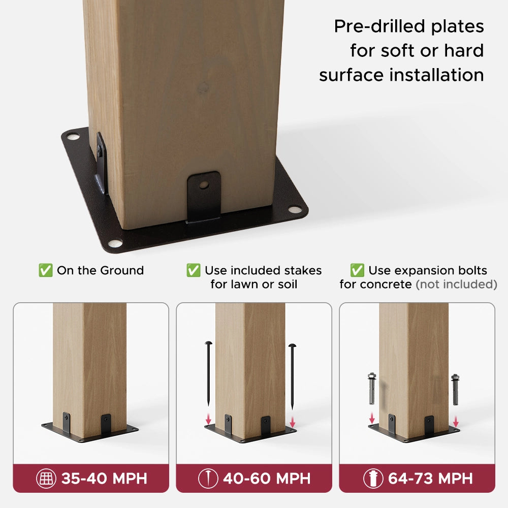 Pre-drilled ground plates with three holes allow you to easily anchor the gazebo to soft ground using the included stakes or to hard surfaces with expansion bolts (not included).