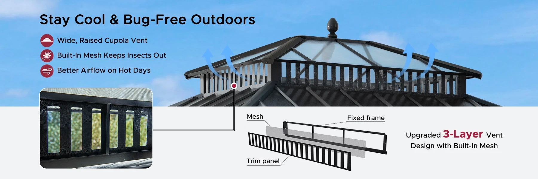 Extra-Tall, Wide Vent Top for Cooling Airflow with Mesh Netting to Block Bugs