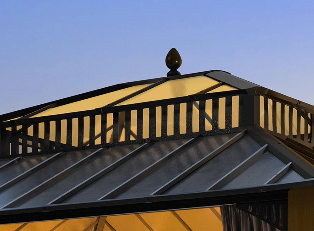 Unlike ordinary gazebos, this one features a dual roof design with a solid galvanized steel top and a translucent PC vent that gently filters light. You stay shaded, comfortable, and protected from harsh sun, rain, or snow.