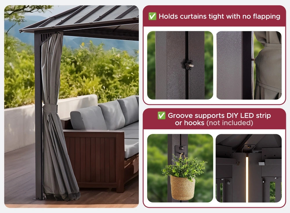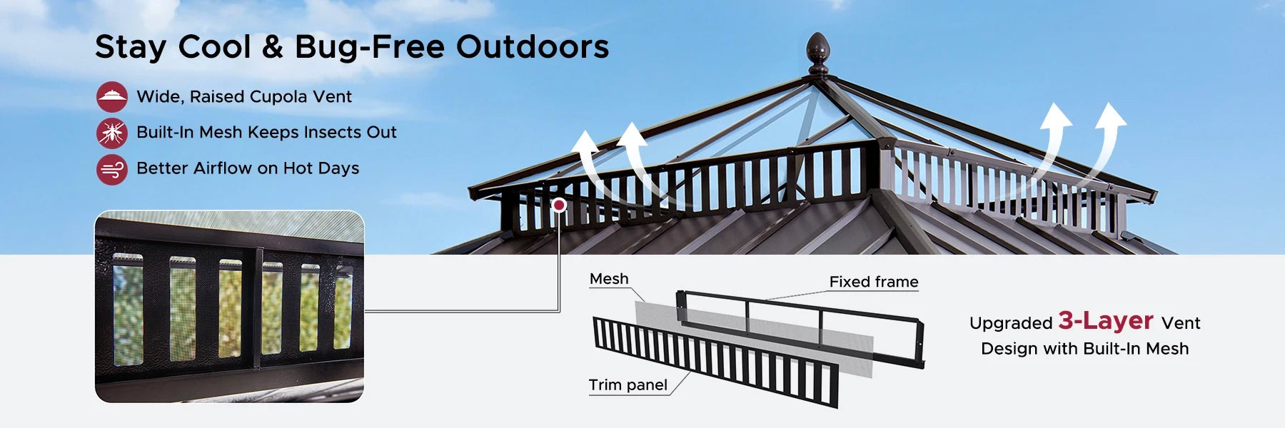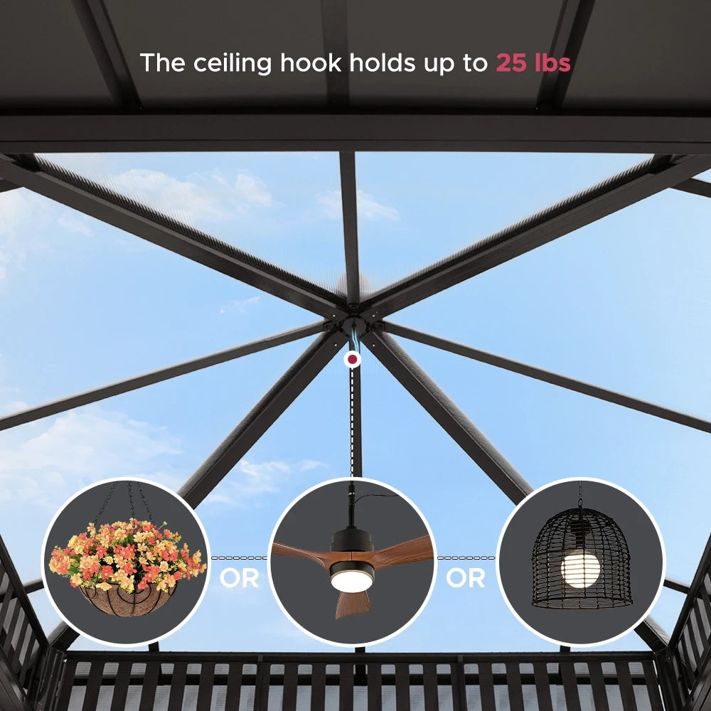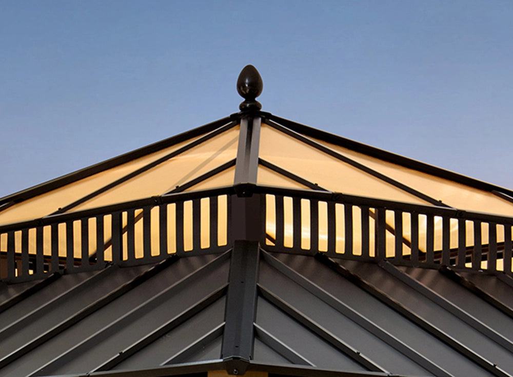 Enjoy easy assembly with a design focused on speed and secure installation. With 40% fewer screws and intuitive snap-together panels, setup is significantly faster. Stainless steel roof screws provide superior weather resistance, while the built-in hook offer convenience for hanging lights, fans, or decor. Ground plates with pre-drilled holes ensure solid anchoring on both hard surfaces and soft ground.