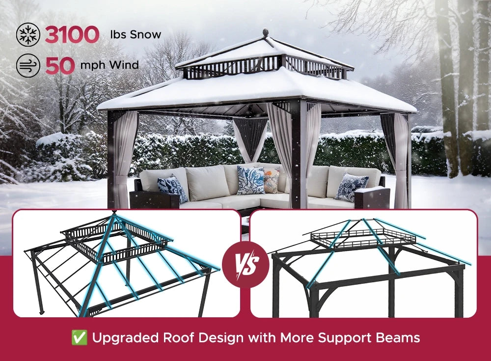 Year-round reliability. SUNJOY gazebos are built to handle harsh weather—sun, wind, rain, and snow—with powder-coated steel and vented roofs.