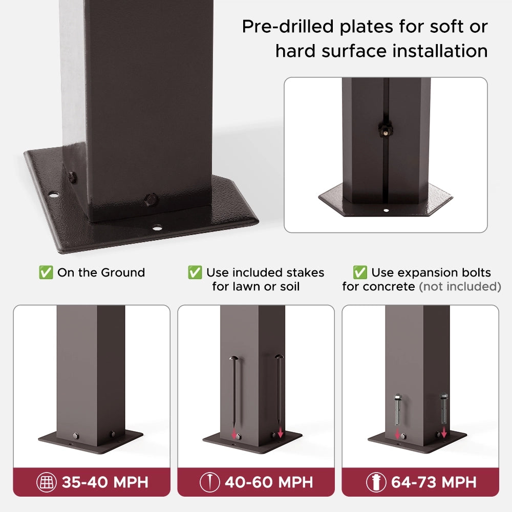 Pre-drilled ground plates with three holes allow you to easily anchor the gazebo to soft ground using the included stakes or to hard surfaces with expansion bolts (not included).