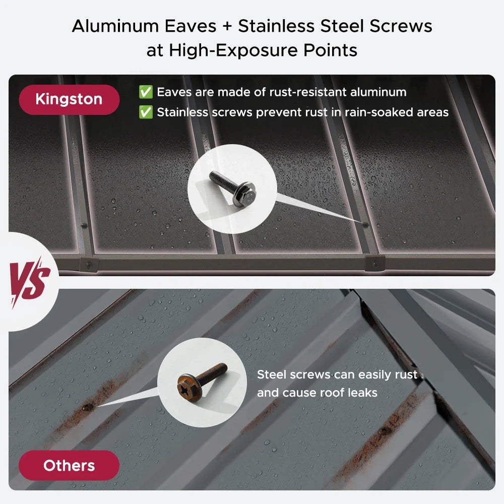 Rain and rust shorten the lifespan of standard fasteners. That’s why Kingston uses stainless steel screws in all roof eave and exterior-facing areas to prevent corrosion—extending the product’s durability and reducing long-term maintenance.