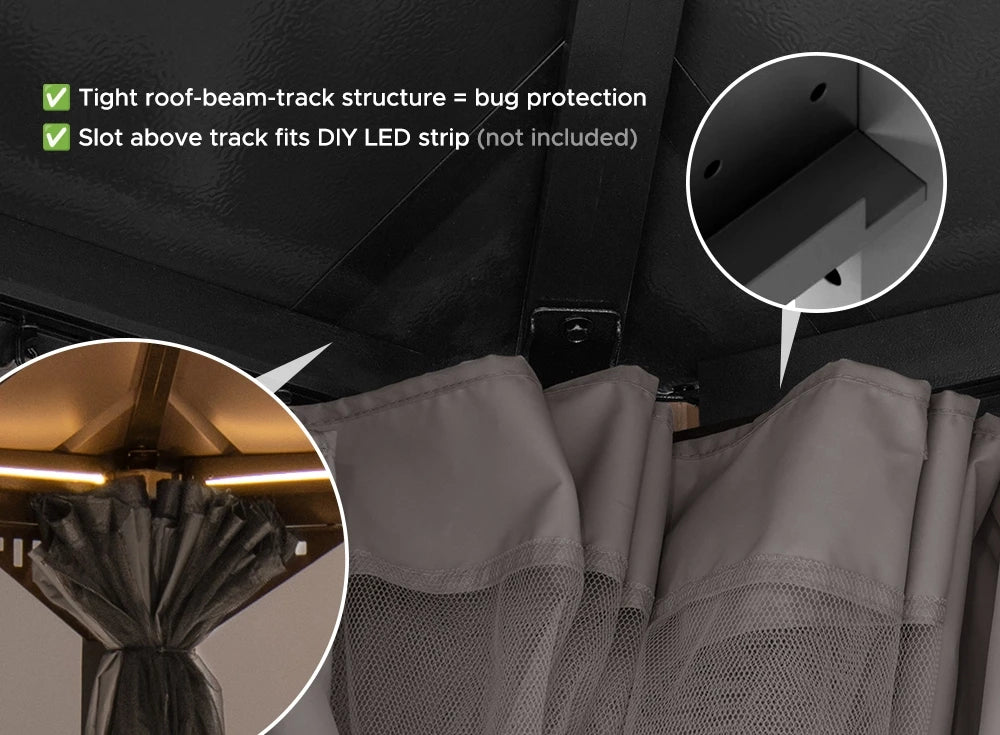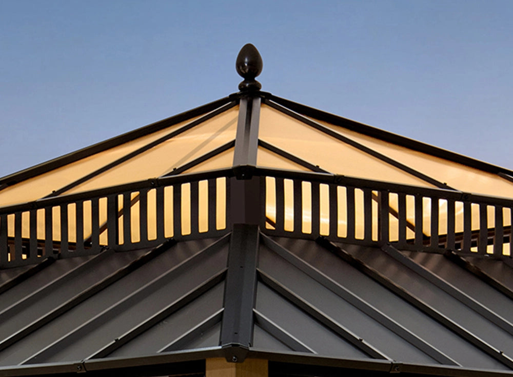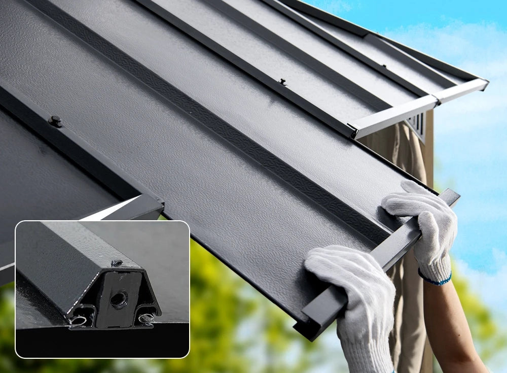 Unlike ordinary gazebos, this one features a dual roof design with a solid galvanized steel top and a translucent PC vent that gently filters light. You stay shaded, comfortable, and protected from harsh sun, rain, or snow.