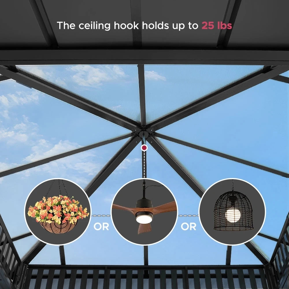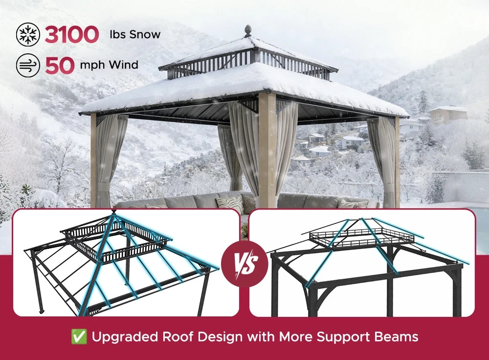 Year-round reliability. SUNJOY gazebos are built to handle harsh weather—sun, wind, rain, and snow—with powder-coated steel and vented roofs.
