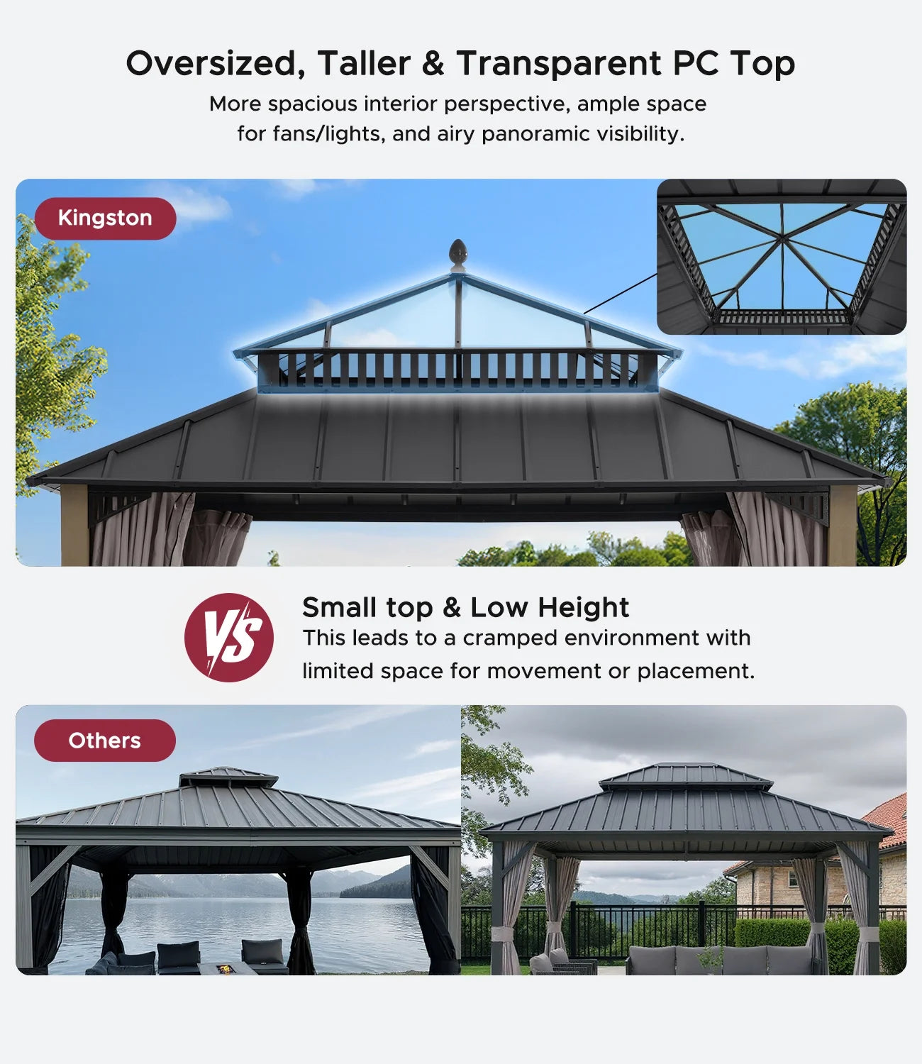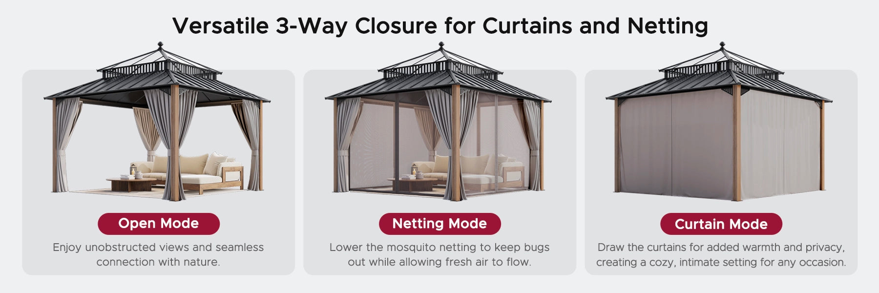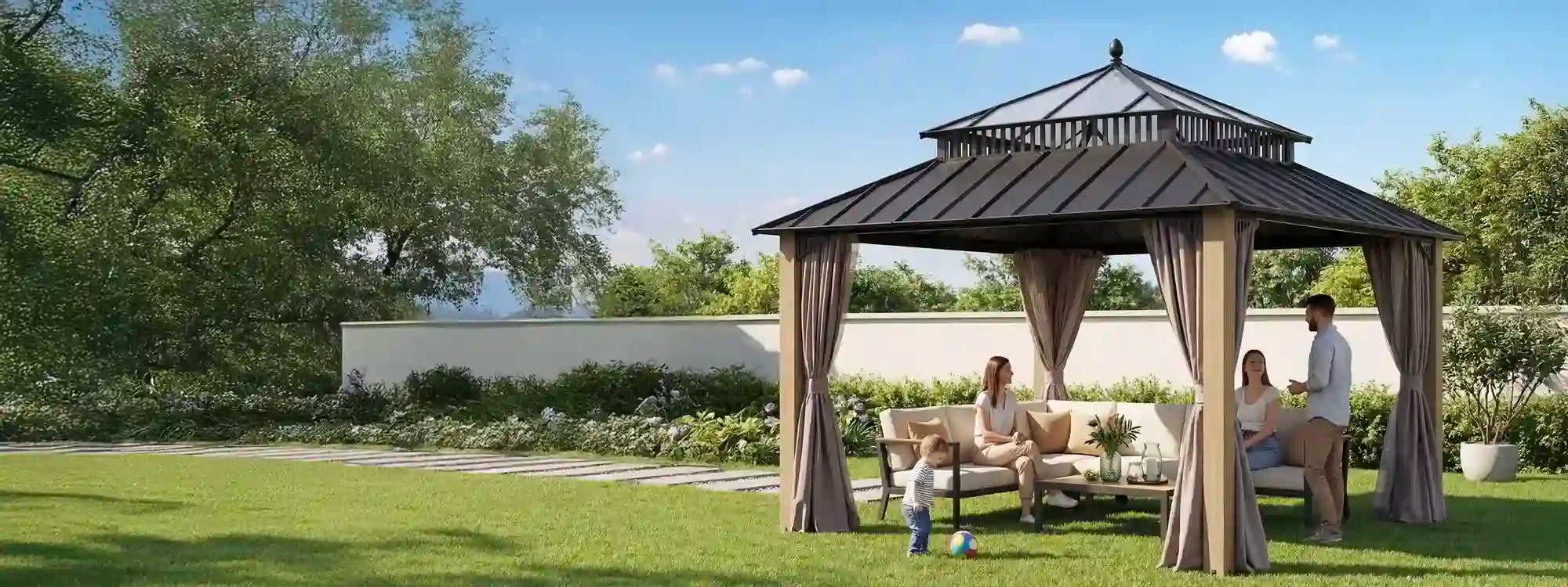 Introducing the Kingston gazebo series — engineered for serious weather, refined for backyard comfort. Crafted with a heavy-duty galvanized steel roof, rust-proof aluminum frame, and DIY friendly design, it provides year-round shelter with standout style.
