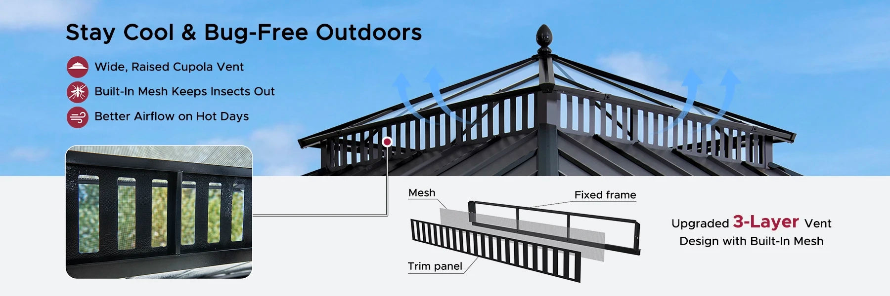 Extra-Tall, Wide Vent Top for Cooling Airflow with Mesh Netting to Block Bugs