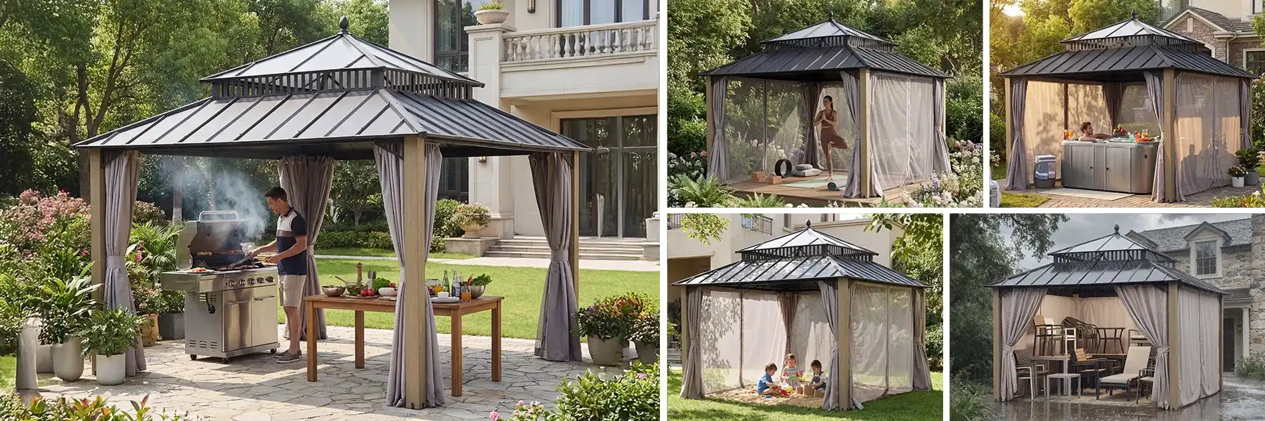Looking for ideas to transform your backyard? Explore these real customer photos and see how Sunjoy gazebos are making a difference in outdoor spaces just like yours. From rustic wooden designs to sleek hard-top models, the possibilities are endless. Perfect for dining, lounging, or entertaining across patios, gardens, poolside spaces, and more—designed to elevate every moment spent outdoors.